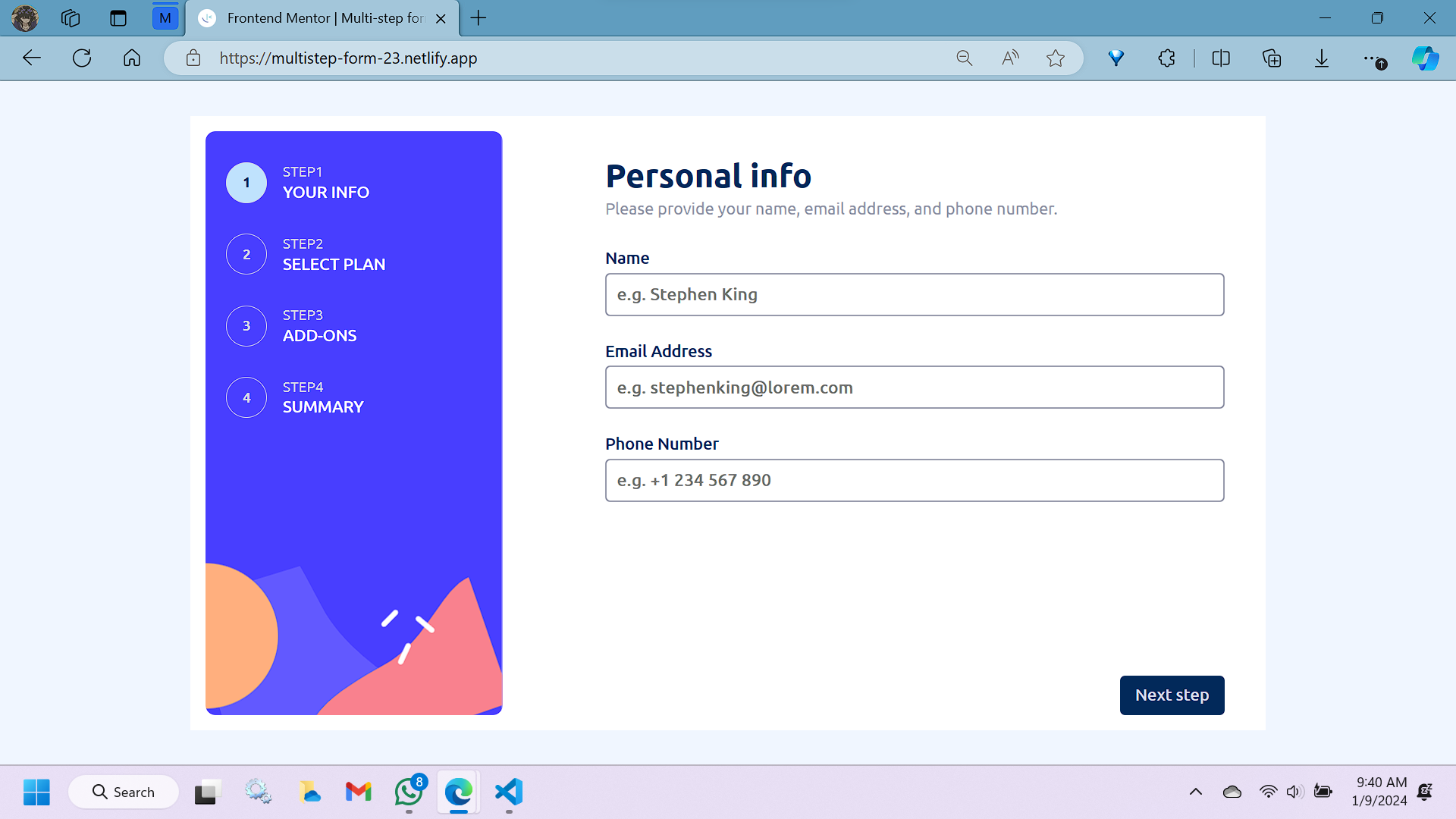 Optimize your online presence with a streamlined multi-step form experience. Responsive design ensures user satisfaction, while efficient state management maintains data consistency for a seamless process.